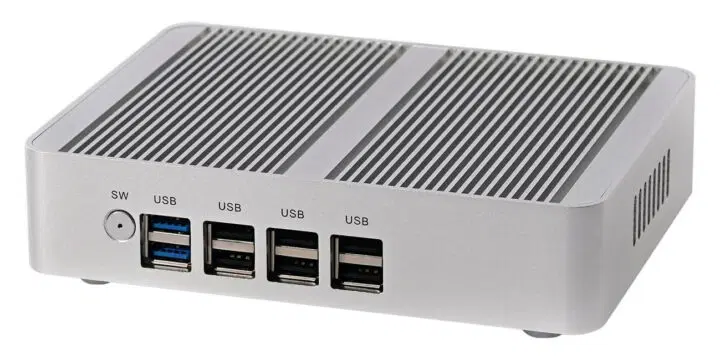 The HUNSN BM34 mini PC meets all of the above criteria, with a price (reportedly) of ~$200 and eight USB ports. Other features include Wi-Fi, Bluetooth, dual Ethernet, speaker output, microphone input, and triple video output. Generic memory modules up to 16 GB, and generic solid-state storage options up to 512 GB can be used with this unit.