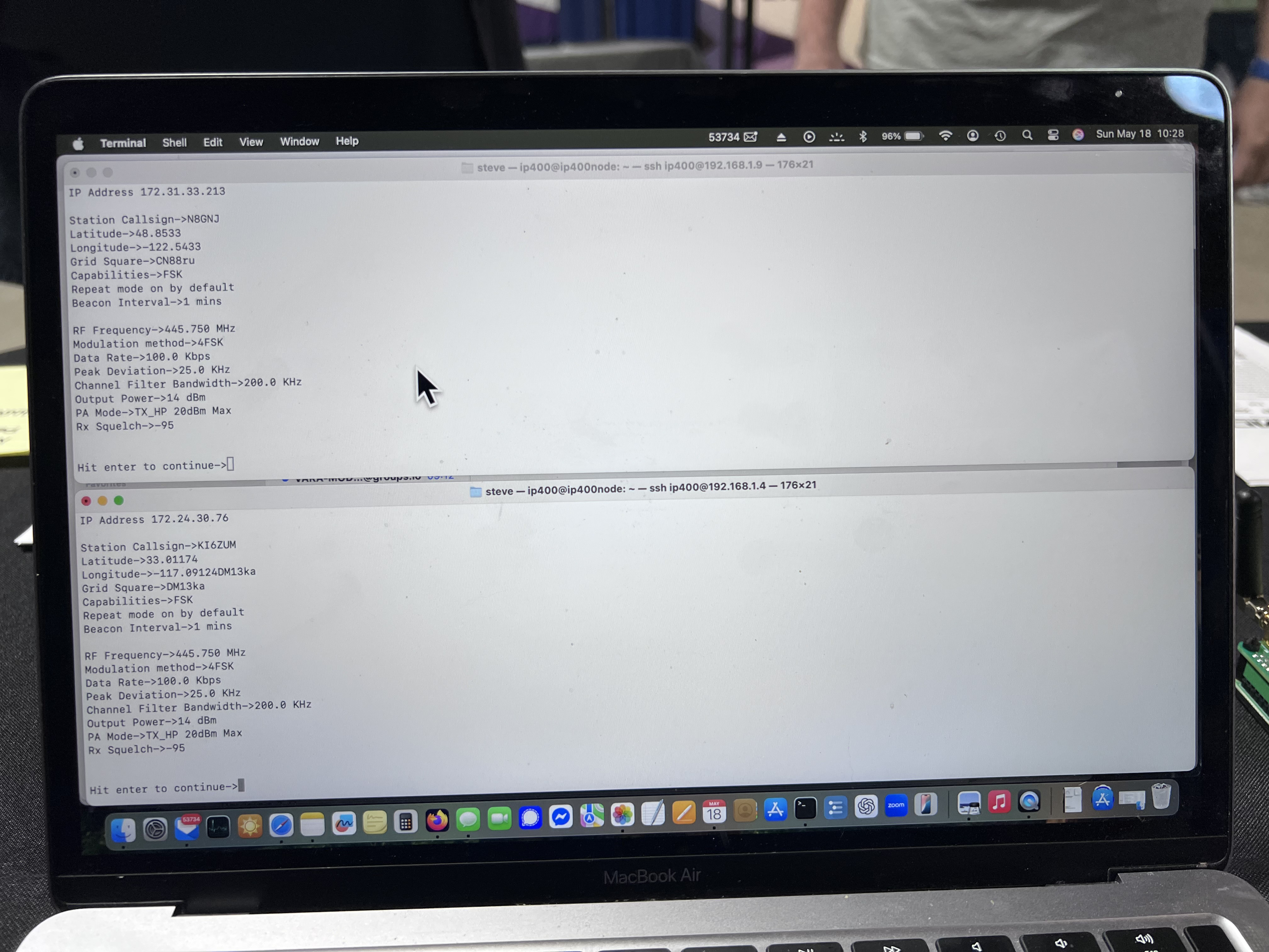 There were some technical issues to be overcome, including the PC laptop that I’d lugged from Bellingham to be the primary display for IP400… failed to boot up - no disk found. Fortunately I had my faithful MacBook Air M1 also with me. I’d not have any hands-on with the units until Hamvention and configuration was a bit tricky, but by Friday mid-afternoon I was capably demonstrating that each of them were hearing each other’s BEACON broadcasts, and the built-in chat application was demonstrating that they were in fact communicating with each other over the air.