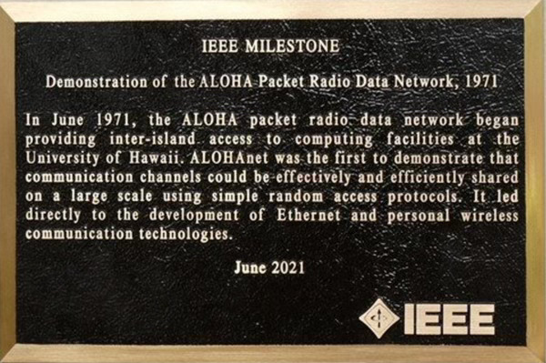 Ollig’s story included a photo of the ALOHAnet plaque (that I wasn’t previously aware of):