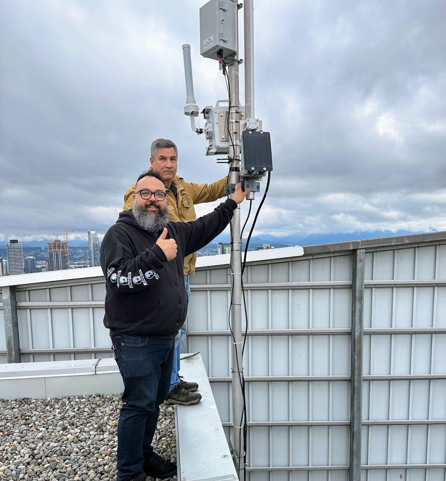 The Surrey Amateur Radio Communications group has installed a solar powered Meshcore repeater at its north repeater site on Concord Tower. This project, led by SARC member Merlin Boissonneault (in black), is an effort to make Meshcore a truly useful emergency messaging platform. Meshcore is an evolution of Meshtastic, which didn't work for us at all. As Merlin puts it, “It’s Meshtastic, except it works.” Initial results are very promising, with many of us messaging successfully last night. Most Meshtastic devices can be flashed with Meshcore. If you have line of sight (or proximity) to the Surrey Repeater at King George & 100 Ave, join us on 910.525 MHz.